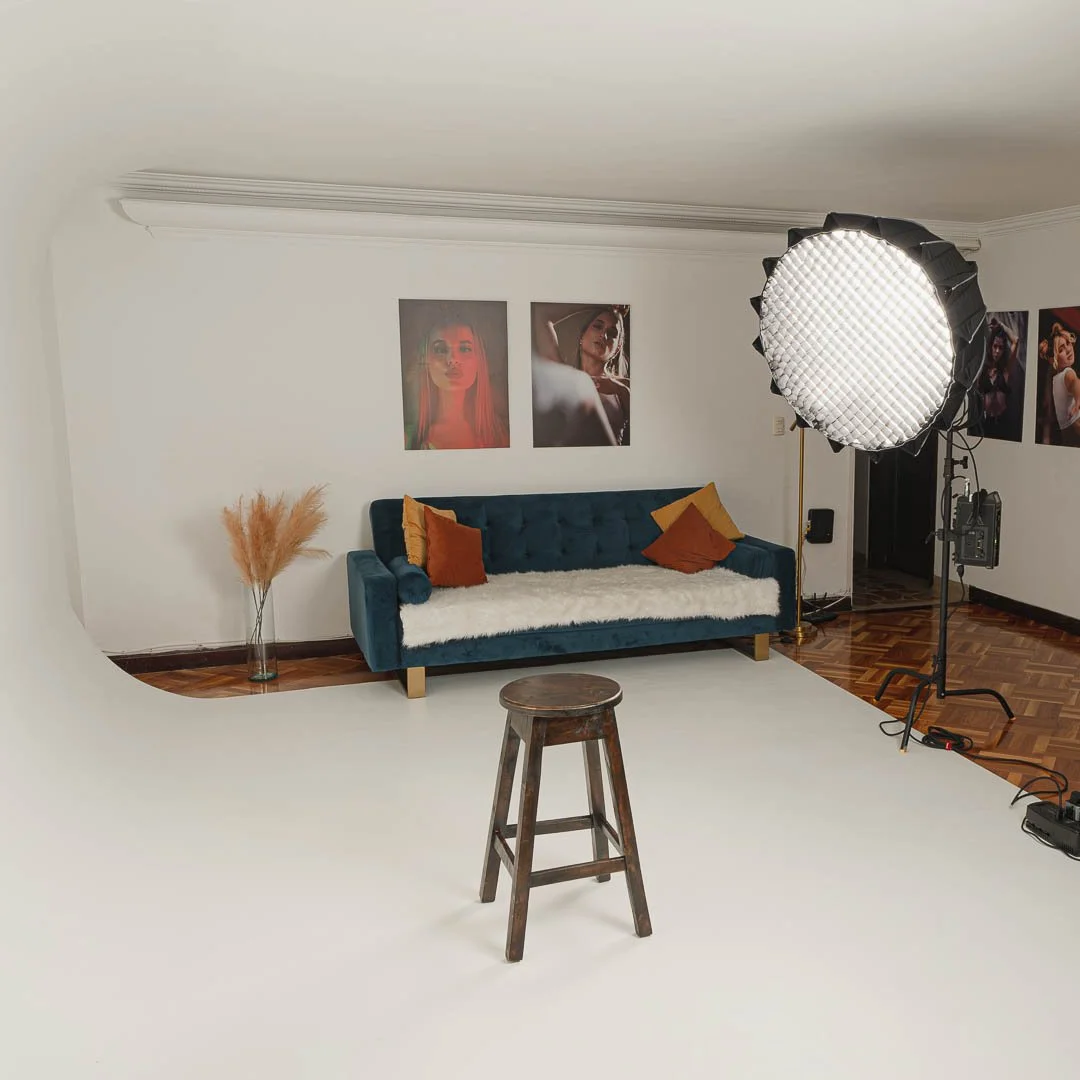 Nuestro amplio ciclorama establece el escenario para una creatividad sin límites. La pared curva de altura completa de piso a techo proporciona un fondo sin costuras, perfecto para todo, desde sesiones de alta moda hasta retratos artísticos.